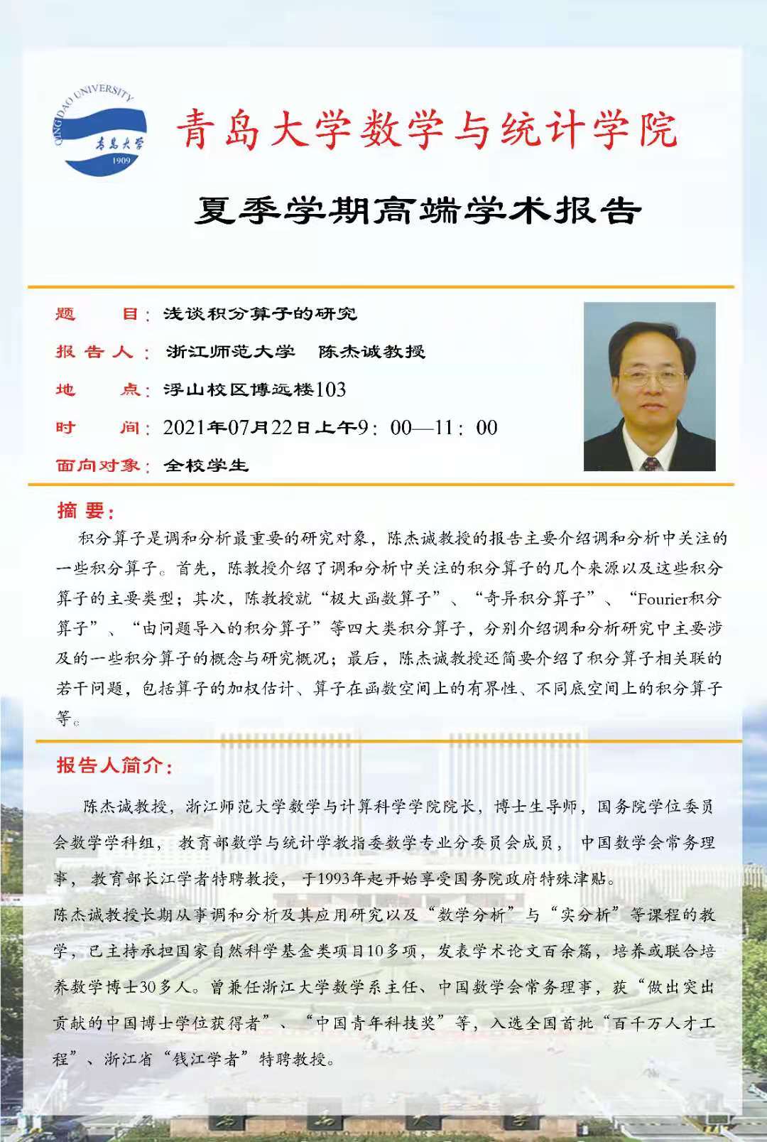 2021年7月22日9:00-11:00,9428cn太阳集团古天乐夏季学期第九场高端学术报告在国际学术交流中心崇德厅举行,来自浙江师范大学的教育部数学与统计学教指委数学专业分委员会委员陈杰诚教授为9428cn太阳集团古天乐师生作了题为:“浅谈大学数学”的学术报告。