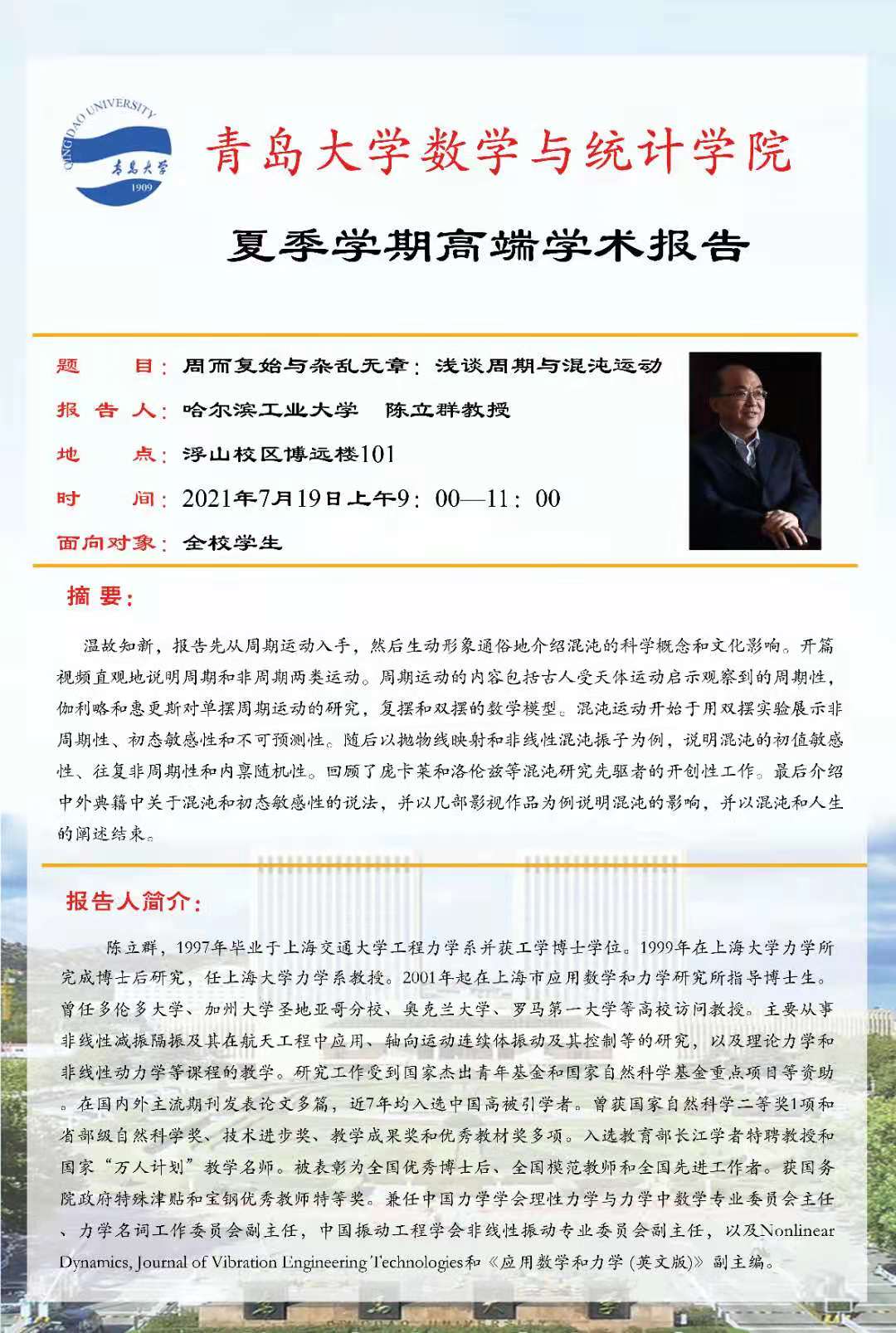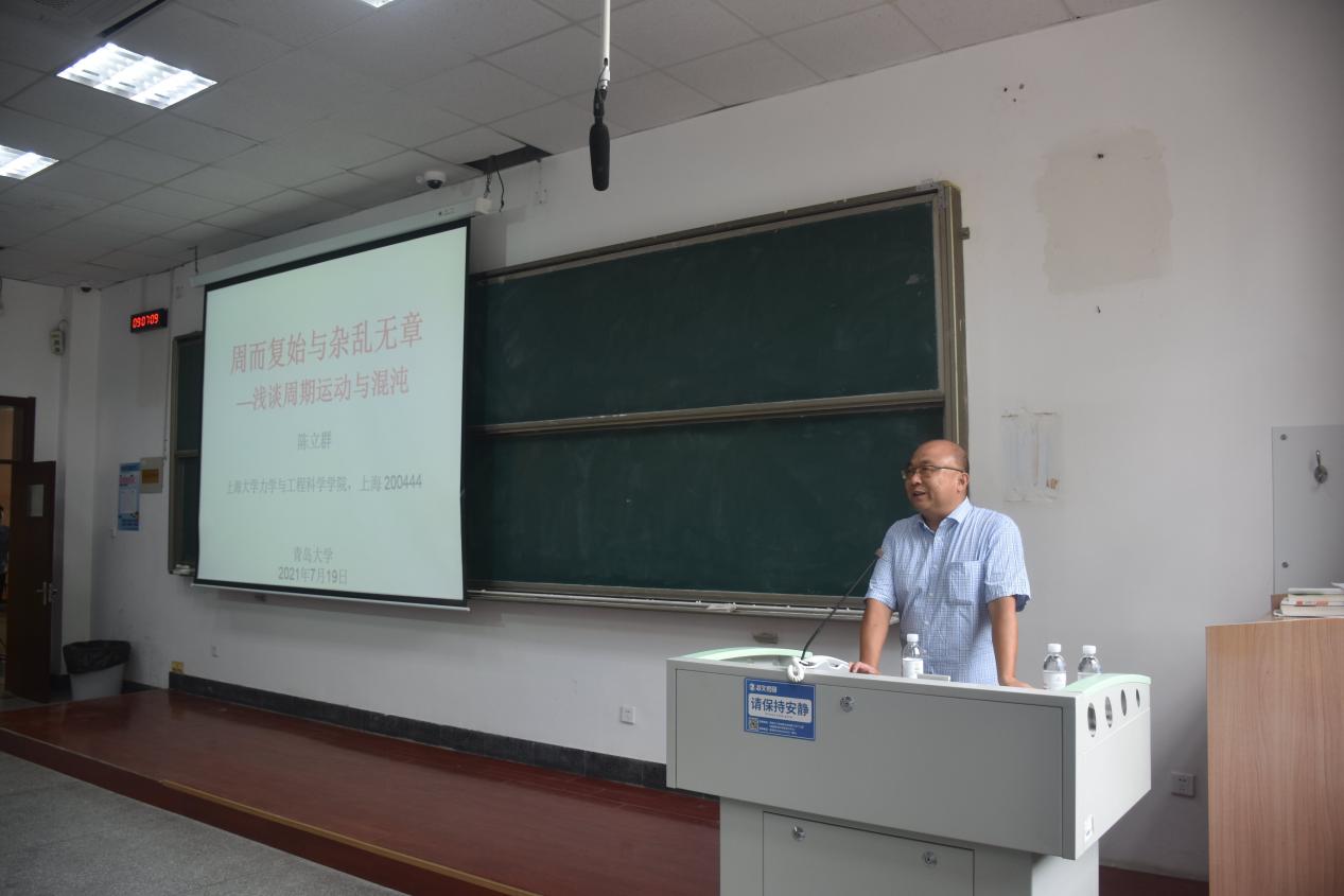 2021年7月19日9:00-11:00,9428cn太阳集团古天乐夏季学期第六场高端学术报告在博远楼101教室举行,来自哈尔滨工业大学的国家杰出青年科学基金获得者、教育部长江学者特聘教授、国家“万人计划”教学名师陈立群教授为全校师生作了“周而复始与杂乱无章:浅谈周期与混沌运动”的通识教育类高端学术报告,9428cn太阳集团古天乐副经理丁洁玉主持报告。