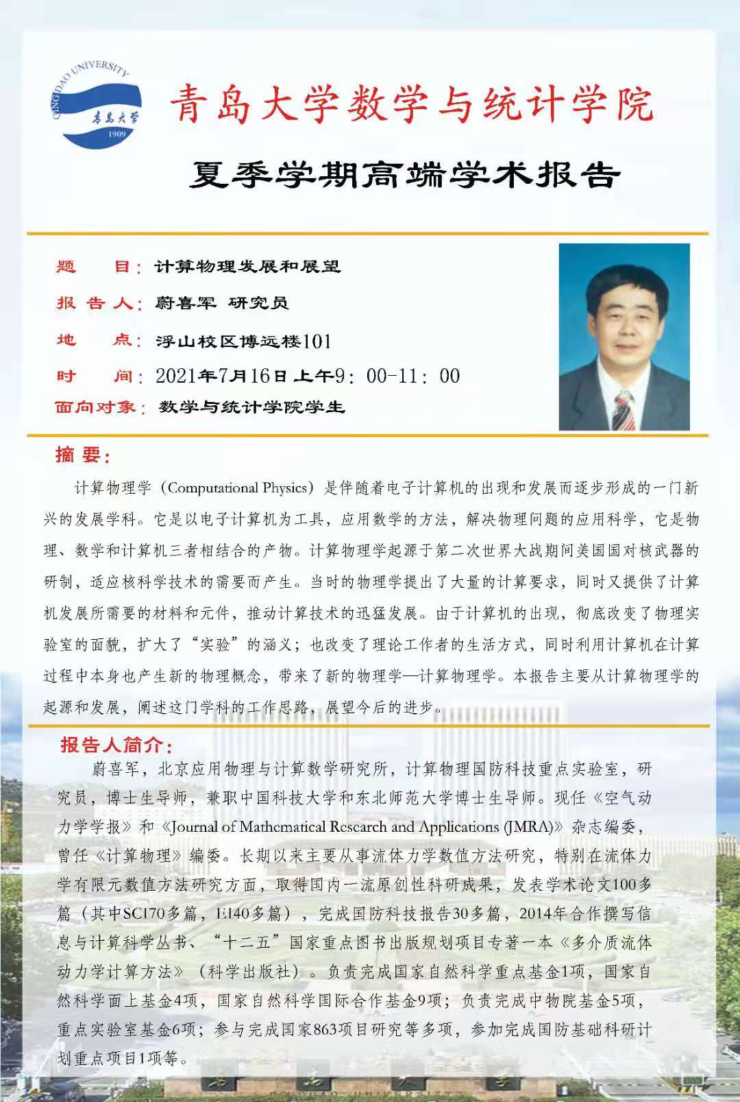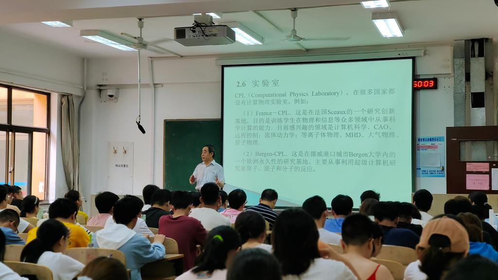 2021年7月16日9:00-11:00,9428cn太阳集团古天乐夏季学期第四场高端学术报告在博远楼101教室举行,来自北京应用物理与计算数学的蔚喜军研究员为9428cn太阳集团古天乐师生作了题为“计算物理发展和展望”的学术报告,介绍了计算物理的历史和未来的发展。