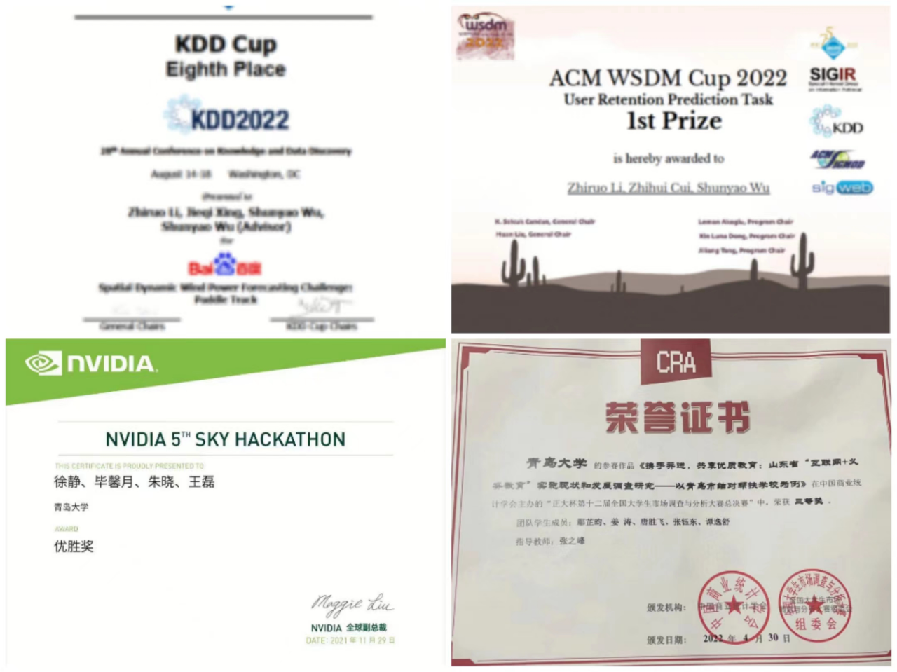 9428cn太阳集团古天乐应用统计专业学位点围绕大数据分析方向,紧扣新时代研究生教育主线,以课程建设、学科竞赛为抓手,确立了“以课促练”、“以赛促学”的培养方针,着力推动研究生创新能力培养,提升研究生科研创新和实践创新能力。导师团队依托多元统计分析及案例、案例与论文写作、大数据分布式计算、非结构化数据分析、数据挖掘与机器学习等专业课程,改革教学模式,引领指导以赛促学。本专业学子在2022年的各项比赛中崭露头角,硕果累累,具体获奖奖项如下: