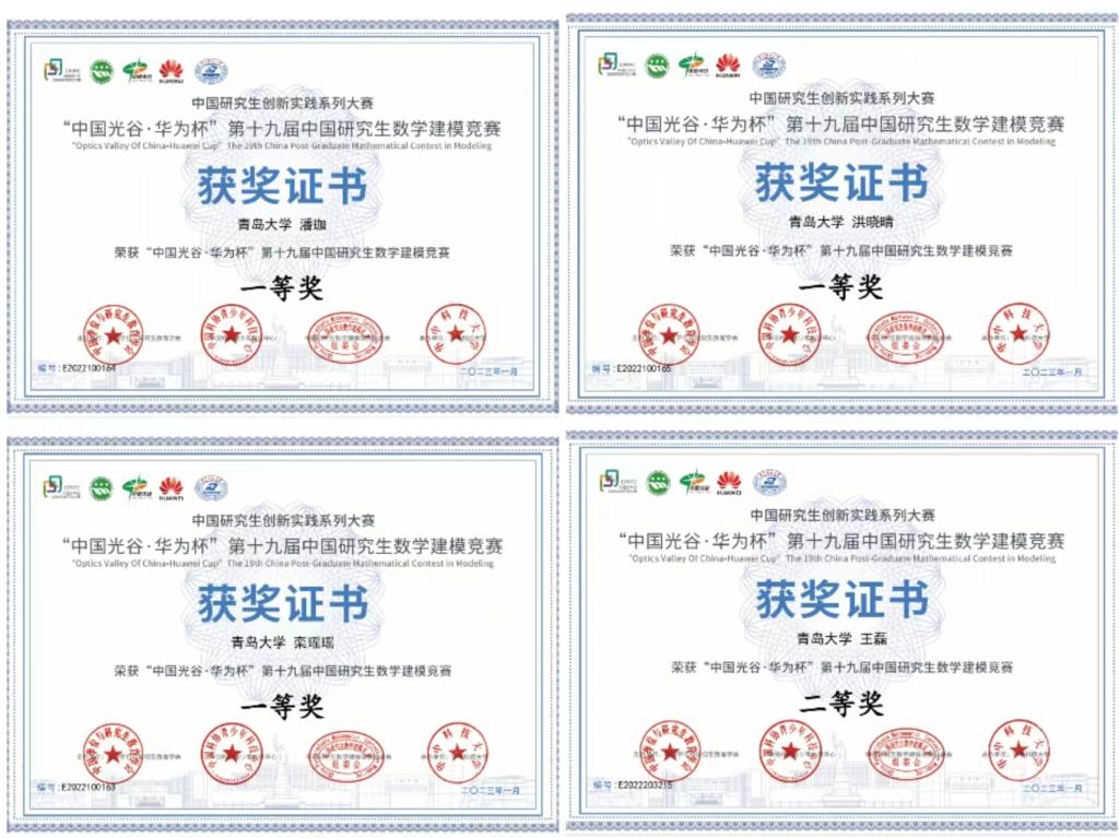 “中国光谷·华为杯”第十九届中国研究生数学建模竞赛,一等奖1项, 二等奖1项,三等奖3项;