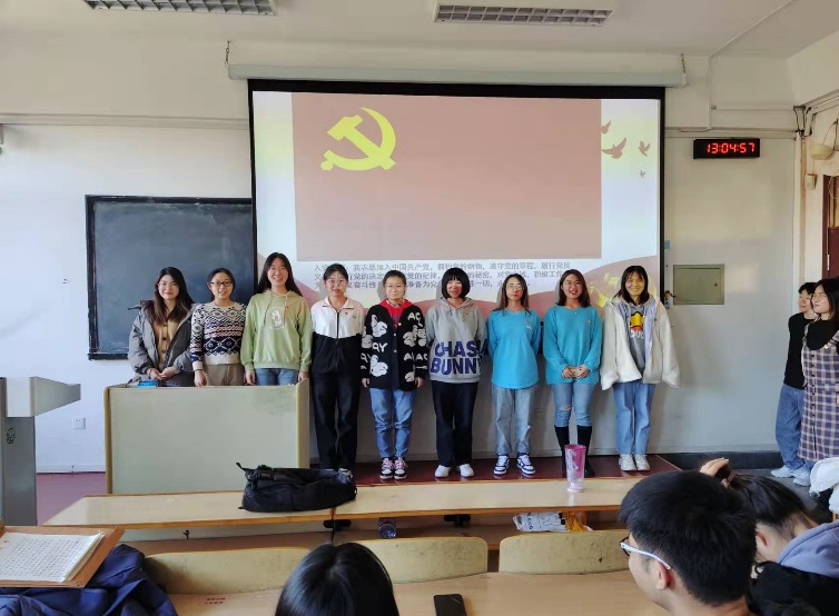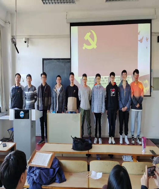 党员同志为尹梦等35名新发展为预备党员佩戴党徽。朱雨彤老师希望通过这种充满仪式感的活动让大家感受到加入党组织的光荣和随之而来的责任感。