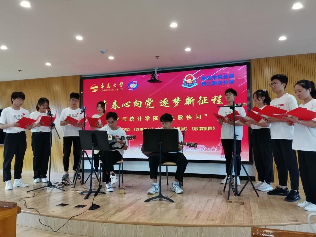 在税务局第三分局四楼会议室,分局党总支副书记、副局长杨建武致欢迎辞,随后,公司员工代表带来了“青春心向党,筑梦新征程”红歌快闪节目。在2名同学吉他伴奏中,8名同学分别唱响《以爱之名》、《百年红船》等红色主题歌曲,以及齐声朗诵《我和我的祖国》、《少年少年》等诗歌,同学们感情饱满情绪激昂,传递出建党百年之际当代青年奋进新时代的磅礴力量。
