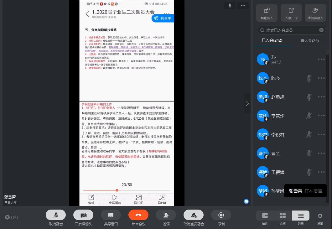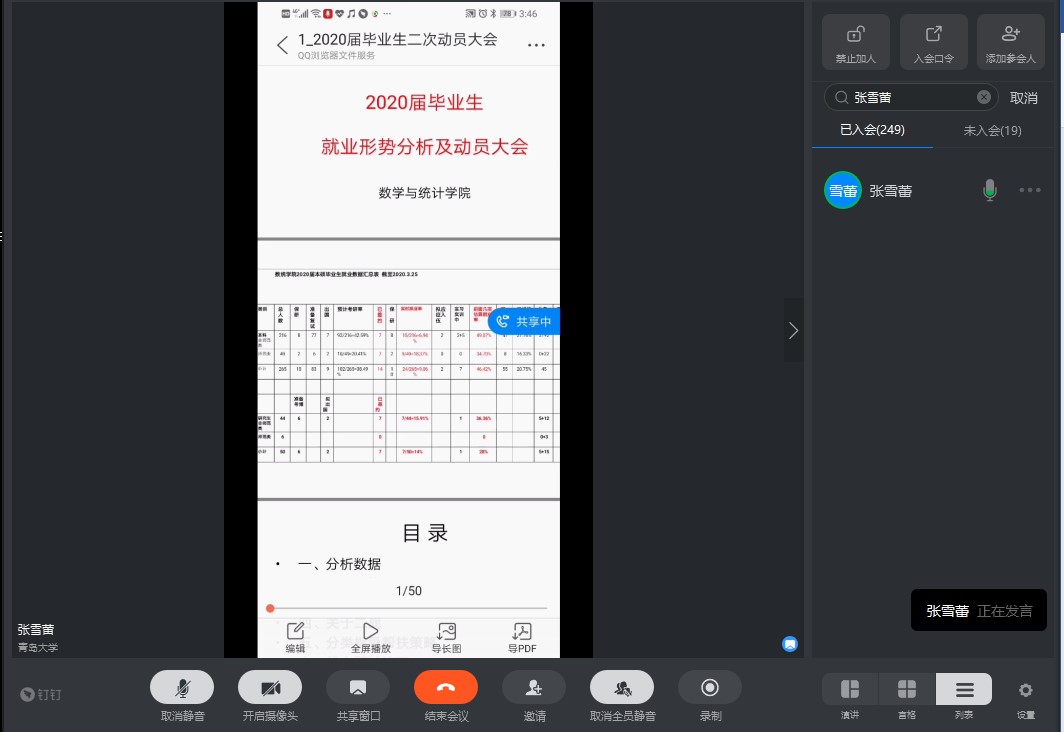 张雪蕾从今年国内外疫情形势出发,从两个方面进行分析介绍:1.结合往年本科生就业数据,指出当前国际形势下经济呈现下行态势,岗位招聘数锐减,毕业生面临巨大就业压力;2.研究生扩招机会难得,考研毕业生应抓住这次机会,争取一次成功上岸,避免“盲从”二战。随后,她介绍了公司层面为促进就业所开展的工作,并提出针对不同同学的分类指导帮扶策略,鼓励有需求的同学主动与结对老师沟通联络。