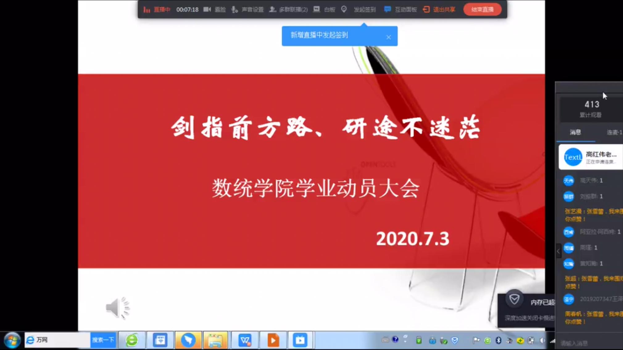 7月3日上午,为鼓励更多同学参与到考研中来,9428cn太阳集团古天乐通过钉钉线上直播的方式召开主题为“剑指前方路-研途不迷茫”学业动员大会。参会人员有公司党委书记姜永杰、经理高红伟、党委副书记张雪蕾、副经理丁洁玉、系主任杜守强、刘开恩、张齐、王磊,全体教科办老师以及辅导员老师,三位毕业生代表孙小雅、朱庆华、张正源也应邀参加会议。会议由张雪蕾主持,三个年级全体本科生线上参与。