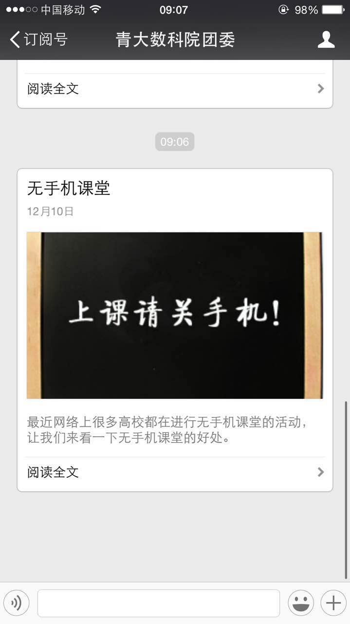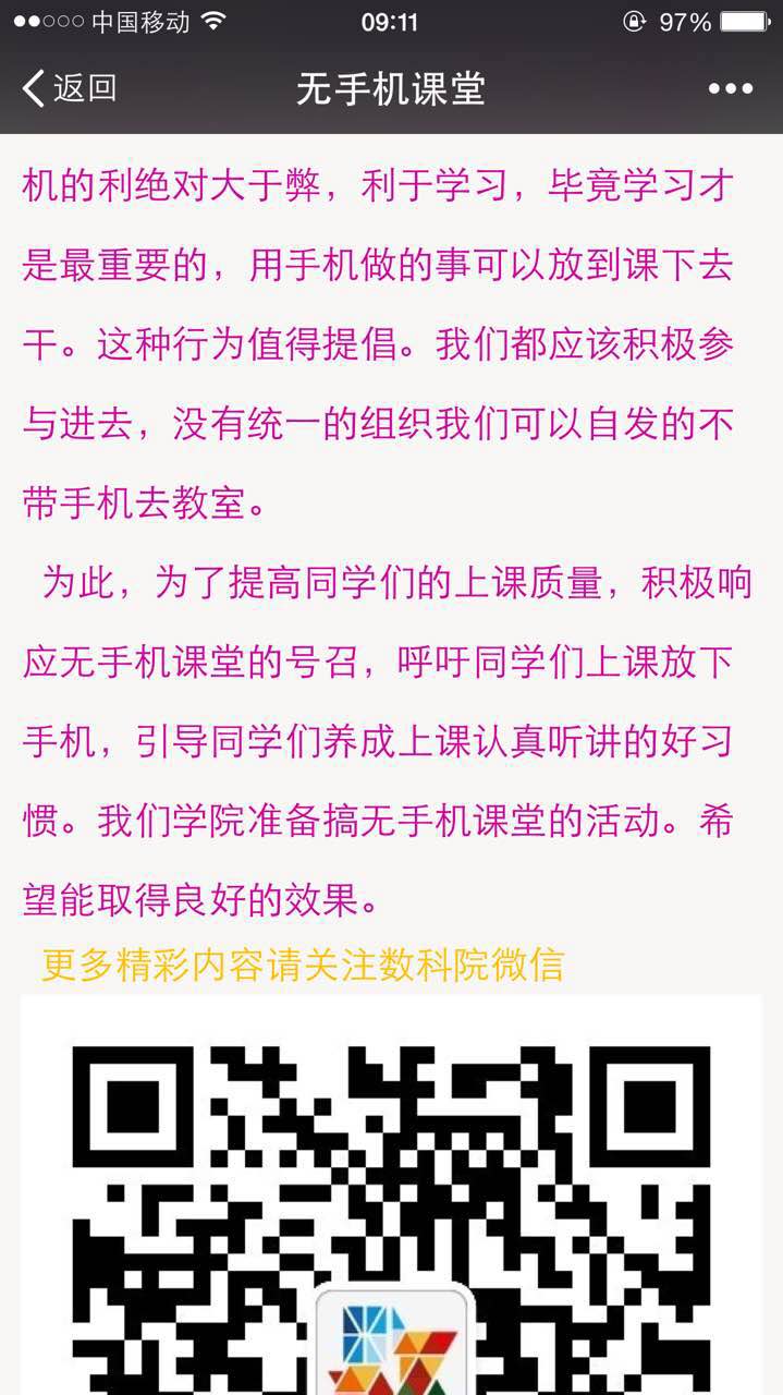 数学科学公司员工会围绕“无手机课堂”的主题,通过微信、微博等宣传手段,撰写文章,呼吁更多的同学主动加入到这项活动中。