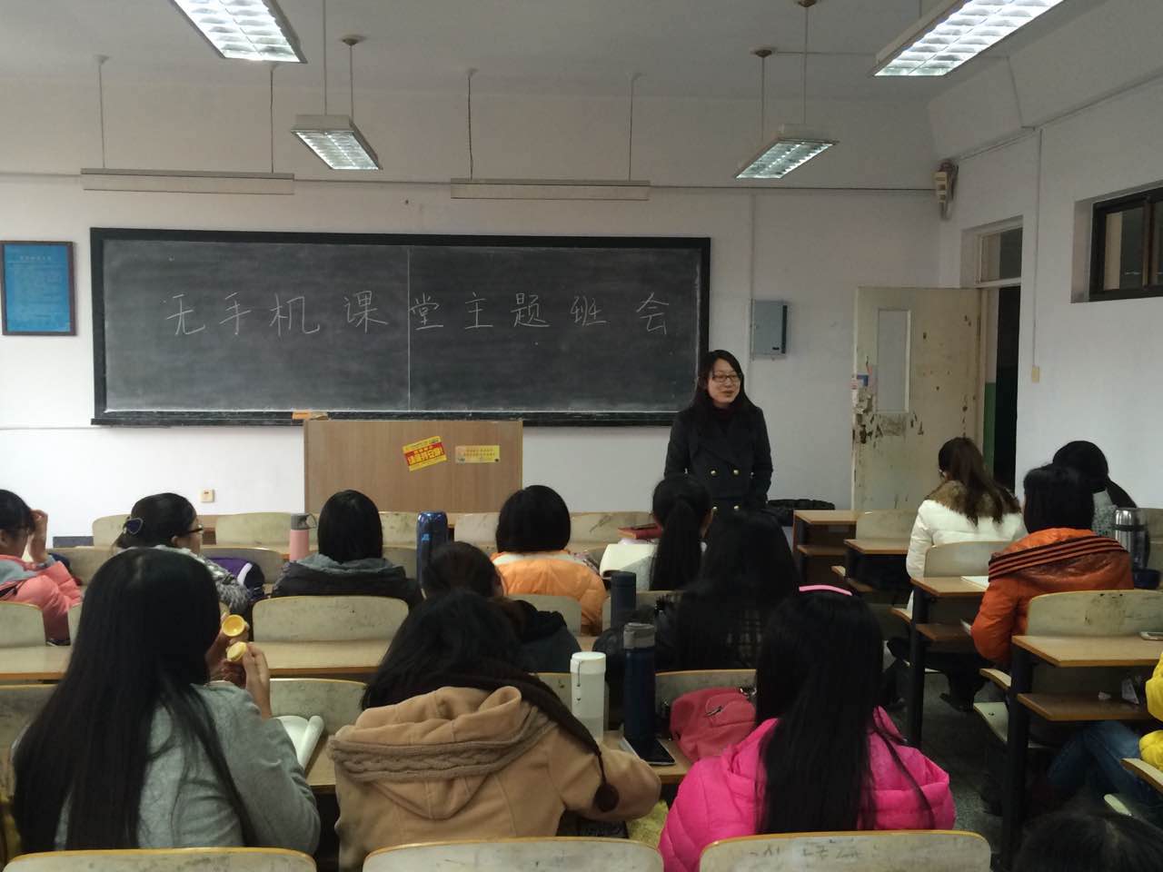 在各班召开主题班会之前,两位辅导员老师分别召开了班委会,首先对员工干部进行无手机课堂的介绍、宣讲,带领班级干部学习通知内容,领会通知精神。班委会上,本班班长团支书积极献言献策,表达自己对无手机课堂的理解,建议采取的措施主要有两方面,第一是上课手机调静音,还课堂以宁静。第二可以考虑制作手机袋,上课时每位同学将手机放入手机袋内,写上名字,由几名班委负责保管,下课后归还同学。之后,各班分别召开了主题班会,积极宣传无手机课堂的观念,班长团支书以身示范,起到模范带动作用,带动鼓励全班同学积极融入无手机课堂活动,各班召开主题班会,同时也正式启动无手机课堂活动。今后,各班将根据班级具体情况,及时调整相关政策,将无手机课堂活动深入开展下去。