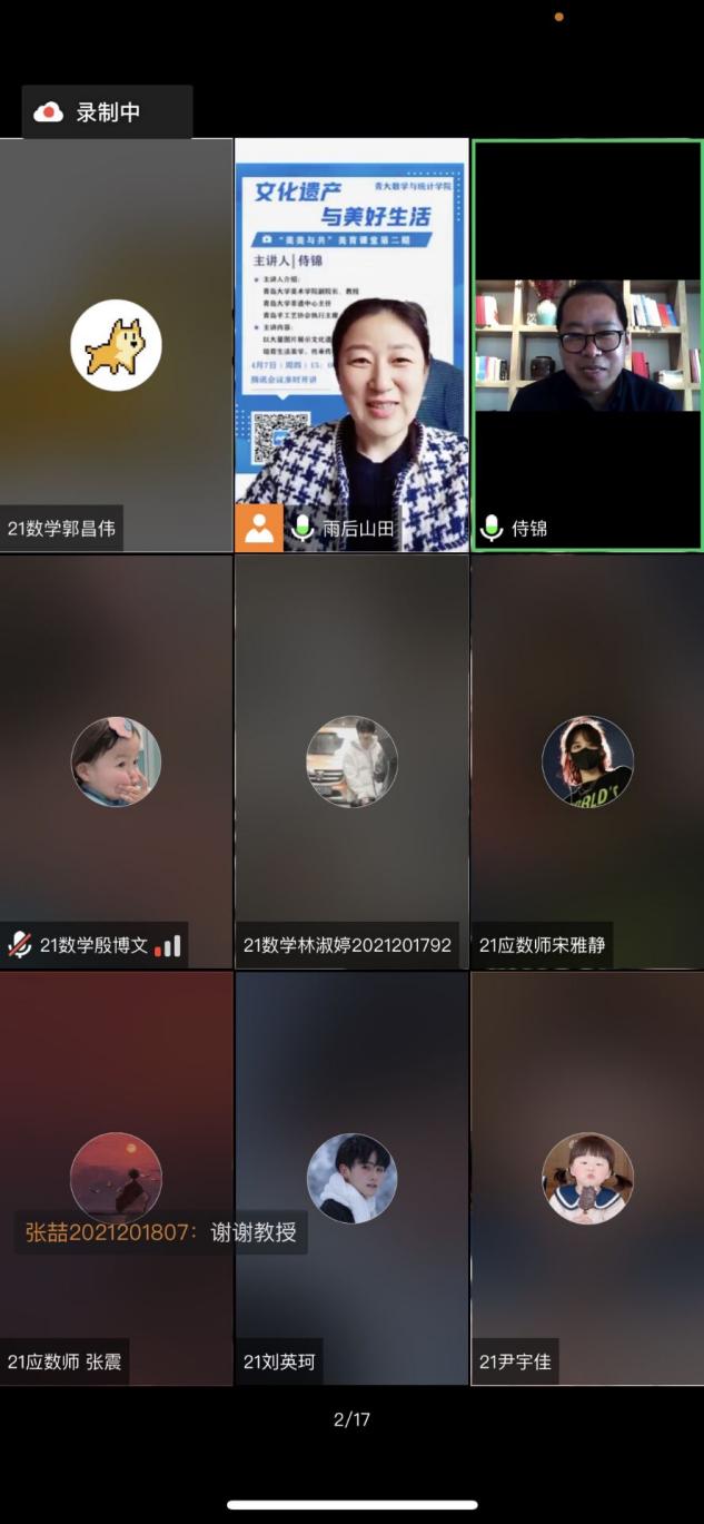 2022年4月7日下午3点,9428cn太阳集团古天乐举办“美美与共”美育课堂第二期,邀请到9428cn太阳集团古天乐美术公司副经理、9428cn太阳集团古天乐非遗中心主任、青岛手工艺协会执行主席侍锦教授,主讲“文化遗产与美好生活”线上讲座。活动由公司党委副书记张雪蕾主持,全院员工积极参与。