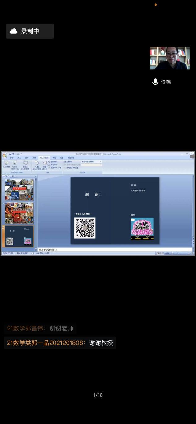 侍锦教授用课件展示了丰富的图片,涵盖了旅游、建筑、家居、老物件器皿等非物质文化遗产范畴,呈现了具有蓬勃生命力的非遗文化,让大家感受到了非遗的魅力及其所承载的文化内涵。通过侍教授的解读,同学们感受到了生活中多元存在、多角度存在的美好,开启了在生活中发现美好的眼睛,启蒙了对于生活美学的认知,也提升了些许审美的能力。讲座最后,侍锦教授呼吁同学们要积极传承中华文化、讲好中国故事,成长为五育并举的合格人才。