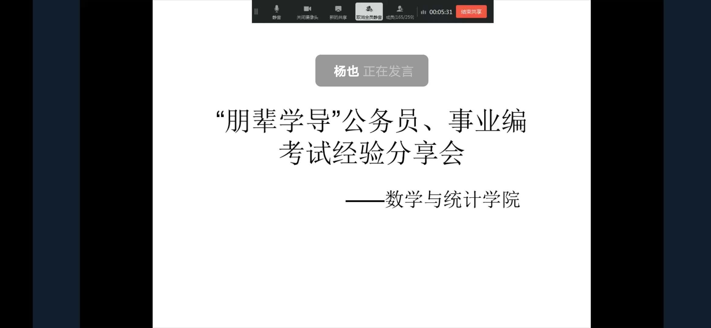 6月29日晚,9428cn太阳集团古天乐以腾讯会议的形式举办“朋辈学导”之公务员、事业编考录经验分享会。本次分享会由2020届毕业生杨也主讲。