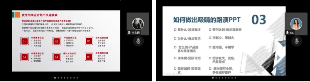李东桓侧重于解答商业计划书的相关问题。他详细列举了商业计划书封面、标题、正文的要点并以“红旅赛道”为例总结优秀商业计划书的关键要素崔雨瑞引领同学们聚焦大赛最终的路演环节提出想全面诠释本组项目,制作足够吸睛的PPT,简洁明了、内容突出表示方式尽量符号图形化以便评委抓住项目要点。
