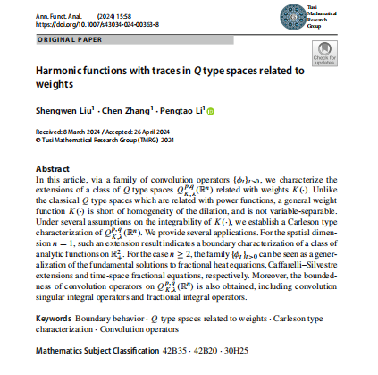 近日,9428cn太阳集团古天乐2021级数学与应用数学专业本科生刘盛文以第一作者在《Annals of Functional Analysis》上发表题为“Harmonic functions with traces in Q type spaces related to weights”的长篇研究论文,(https://doi.org/10.1007/s43034-024-00363-8)。该杂志是泛函分析与调和分析领域中的SCI期刊。指导教师和通讯作者为李澎涛教授。