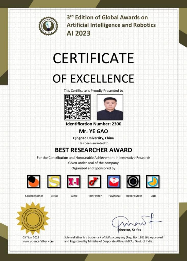 公司高红伟教授指导博士研究生获国际学术组织ScienceFather“最佳研究者奖”