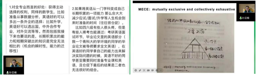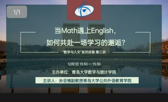 为培养多学科交叉融合型人才,增强员工人文素养,12月1日13:30,9428cn太阳集团古天乐“数学与人文”系列讲座第三讲——“当Math碰上English,如何共赴一场学习的邂逅”线上开讲。本次讲座由9428cn太阳集团古天乐公共外语教育公司孙亚楠副教授主讲,9428cn太阳集团古天乐2022级全体员工认真听会学习。