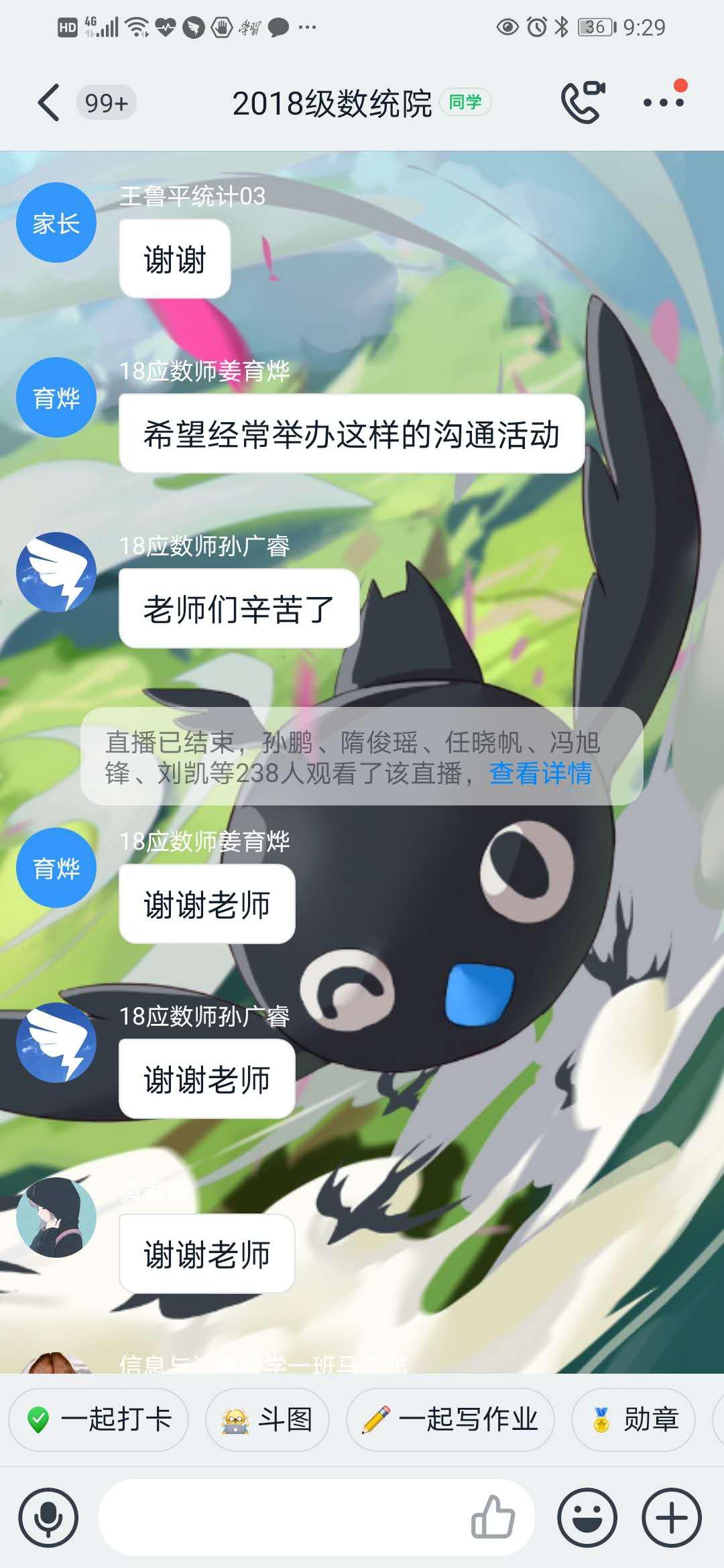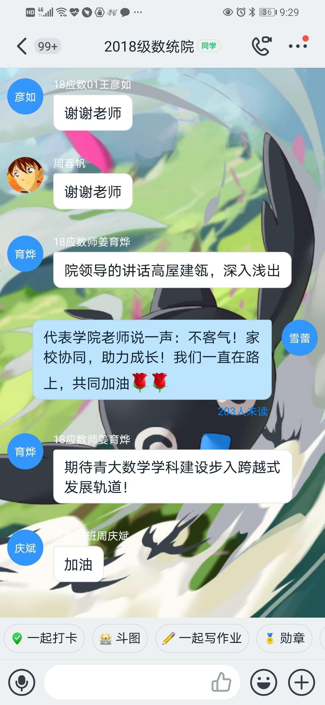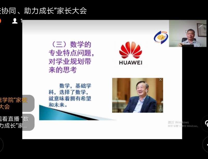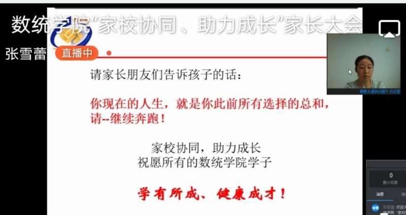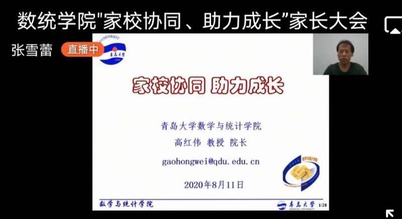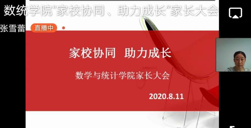 8月11日晚7:30,为实现全员育人、协同育人,数学与统计公司面向2017级、2018级、2019级三个年级本科生的家长们,以钉钉会议线上直播的方式召开“家校协同,助力成长”家长大会,2017级暑期在校员工的家长也通过单独的家长钉群联群参会。会议由公司党委书记姜永杰书记、经理高红伟主讲,党委副书记张雪蕾主持,公司班子全体成员及辅导员老师,以及约七百三十多名家长共同参加。