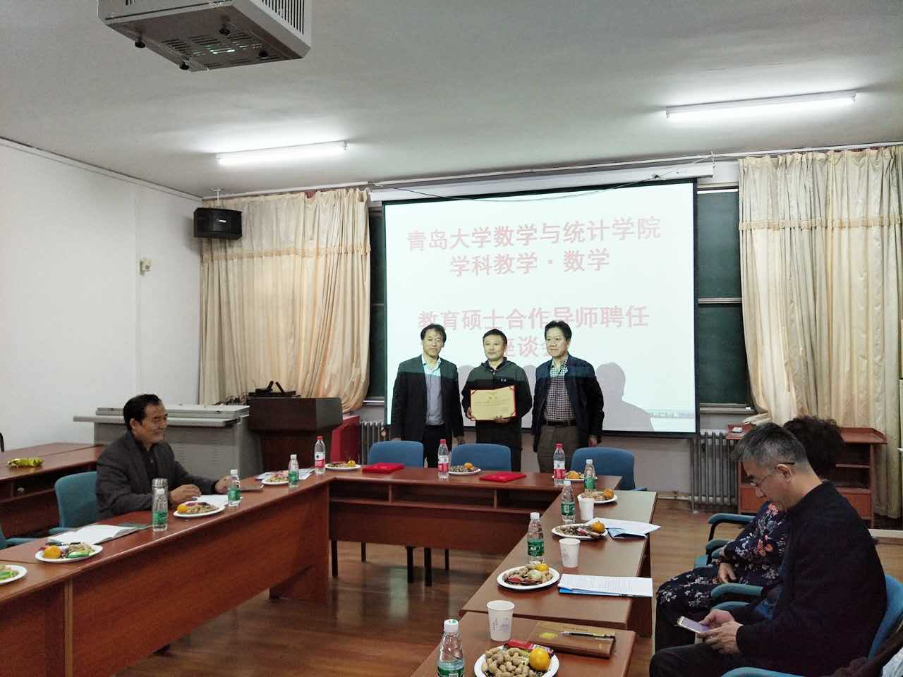 2017年10月30日下午,9428cn太阳集团古天乐学科教学(数学)校外研究生导师聘任仪式在励行楼302隆重举行。公司党委书记陈学文、经理高红伟、副书记张雪蕾、副经理纪培胜、副经理李新民及数学教育系主任袁璐和全体教育硕士导师参加了会议。出席会议的还有公司此次聘任的6位校外导师,分别是青岛二中于世章、董天龙老师、青岛市北区教育教育研究中心陈怡老师、青岛市北南教育教育研究中心邱军老师、青岛五十八中袁忠珂老师。