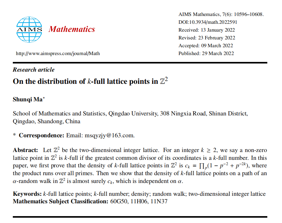 [2] Shunqi Ma. On the distribution of -full lattice points in . AIMS Mathematics(2022), 7(6): 10596-10608.