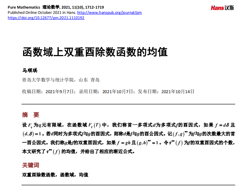 [3] 马顺琪. 函数域上双重酉除数函数的均值. 理论数学(2021), 11(10): 1712-1719.
